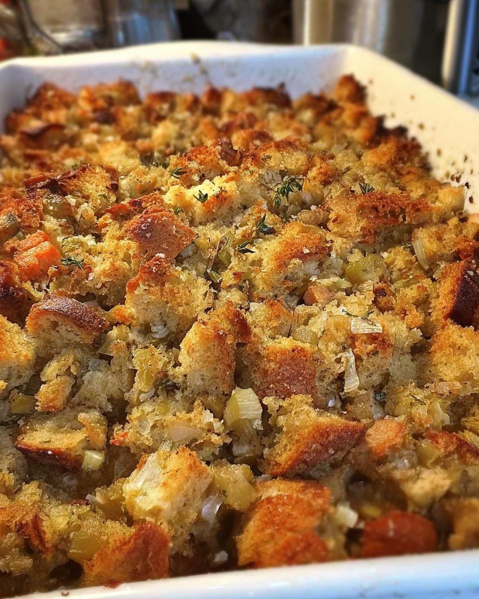Close-up of a baking dish filled with golden-brown restaurant-style stuffing, featuring chunks of bread and visible vegetables.